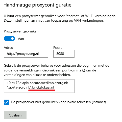 Let op: als er een proxy is ingesteld moet er een uitzondering worden toegevoegd. Windows-knop -> "proxy", selecteer "Proxyinstellingen" . Dan onderin moet *.brickslokaal.nl worden toegevoegd: