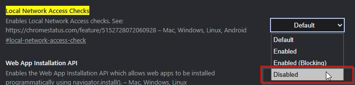 d) Ga naar : chrome://flags/#local-network-access-check en zet deze uit.